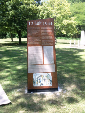 Pour comprendre l’histoire, je me suis basée sur les travaux effectués par les élèves de CM2 de l’année scolaire 2010/2011 sous la coordination pédagogique d’Eric GILBERT, directeur des recherches documentaires, et de Martine Sollacaro, responsable BCD. Depuis le parking, un cheminement piéton donne accès au chemin forestier et à la prairie par l’angle sud-ouest. Une haie de charmille qui devra être maintenue à 0.9 m de hauteur cadre l’entrée. Un totem présente plusieurs documents présentant ou évoquant l’évènement historique. L’aire gravillonnée qui autrefois entourait la stèle, a été engazonnée pour retrouver la simplicité du lieu. J’aurais souhaité, par l’enfouissement partiel d’un pneu de fourgon similaire à celui qui s’était arrêté là en 1944, donner du lien entre la prison de Montluc, cet évènement local et les autres massacres qui ont eu lieux dans le département de l’Ain. Malheureusement cette proposition n’a pas été retenue pour le moment.